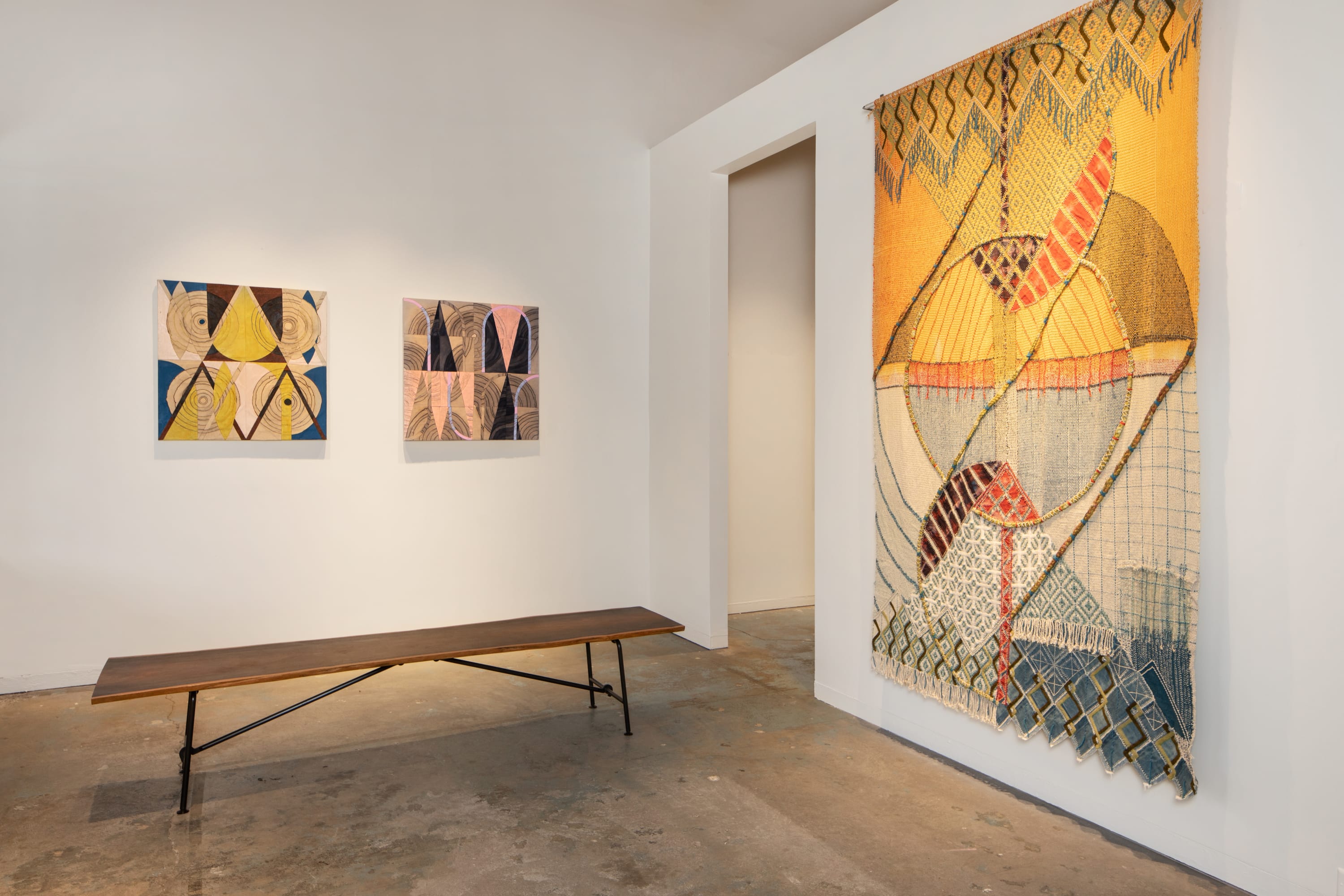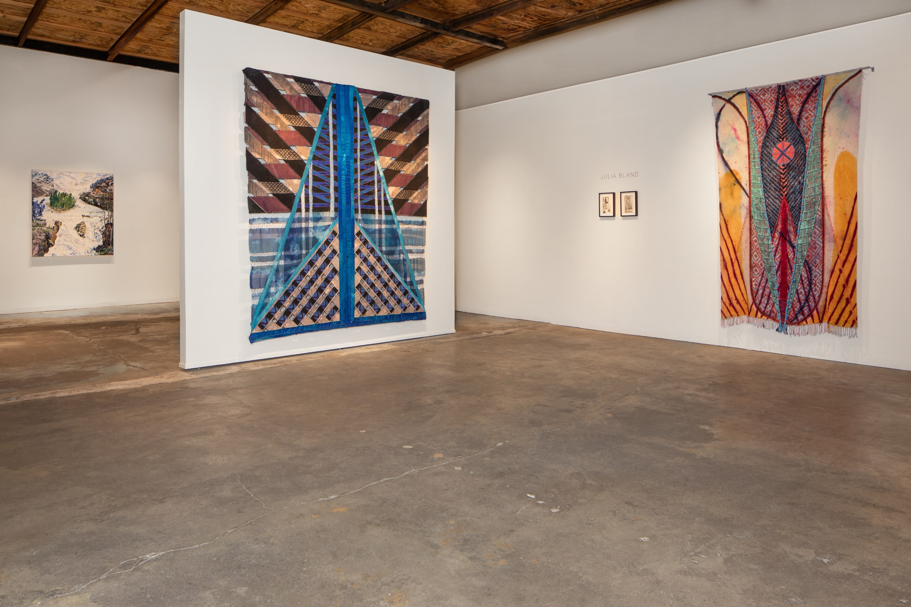 Julia Bland makes artworks that exist somewhere in the space between painting, sculpture, and tapestry. Her experimental process incorporates stitching, weaving, knotting, dying, and even burning her materials, creating sublime abstractions of geometric compositions. This exhibition, Bland’s first at Tayloe Piggott Gallery, also features oil and canvas collages, as well as Bland’s drawings, which help her think through her ideas, functioning as a kind of map with different marks indicating the process or material she intends to engage. A digital catalog will accompany this exhibition with an essay by Glenn Adamson, which is excerpted below.