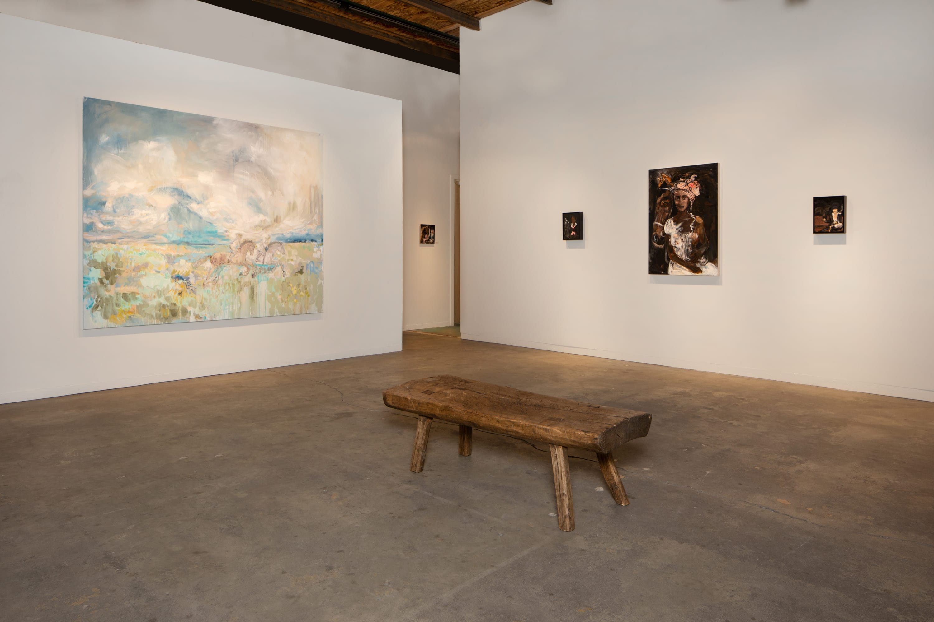 Presented in two rooms in the gallery’s main space, the exhibition probes the history of the domestic space, a theme running throughout Suzy Spence’s work, with wild, galloping landscapes offering a window looking out-of- doors. Billowing clouds puff out over a gestural, almost saccharine blue-and-ochre landscape in Cloud Gallop, as two riders nearly indistinguishable from the field of golden wildflowers race across the expanse. Back indoors, with a nod to equestrian portraiture, another Spence motif, Royal Ascot (flowers) is emblazoned with a massive floral headpiece and gauzy gown that could feel equally at home in a baroque masterpiece (Charles le Brun’s Louis XIV, e.g.) or on the runway of an Alexander McQueen show. Spence’s brushstrokes have the quick confidence fitting for such a juxtaposition; New York school, but make it history.
