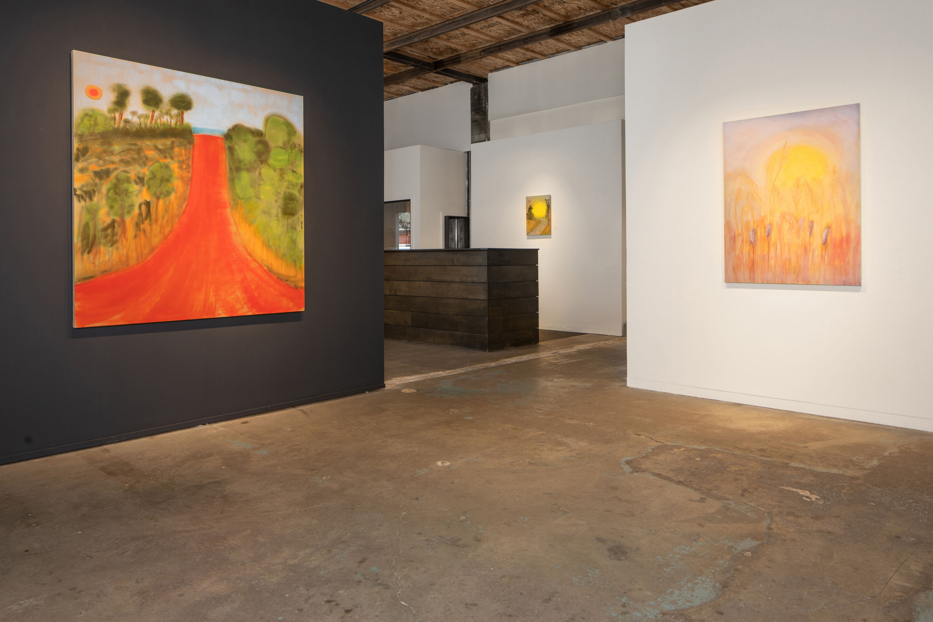 Landscapes are rendered timeless, parsed into near symbols: a road is represented by an intrepid cascade of ochre red, cars emerge as suggestive lines and blots of safety-orange, the sun is emphatically reduced to a vermillion orb. In paint handling, Lynch is sparing, working with confident brushstrokes in thinly veiled washes thrown open by the climactic flash of a brilliant tangerine sun. In many of these works, which are marked by a nebulous haze that engulfs the subject matter, the sun is not only the principal subject, but also the primary actor. “When the sun is really big, it actually makes you squint, and it creates a white haze… the sun itself has sort of created that haze… You can’t really look at anything so you’re just peeking.” Lynch uses these snapshots of memory and feeling to create dream-like and distinctly atmospheric works that not only capture the drama of different hours of the day and effects of light and time on a place, but also the experience of being present in those times, lights and places, of being within and subject to nature.