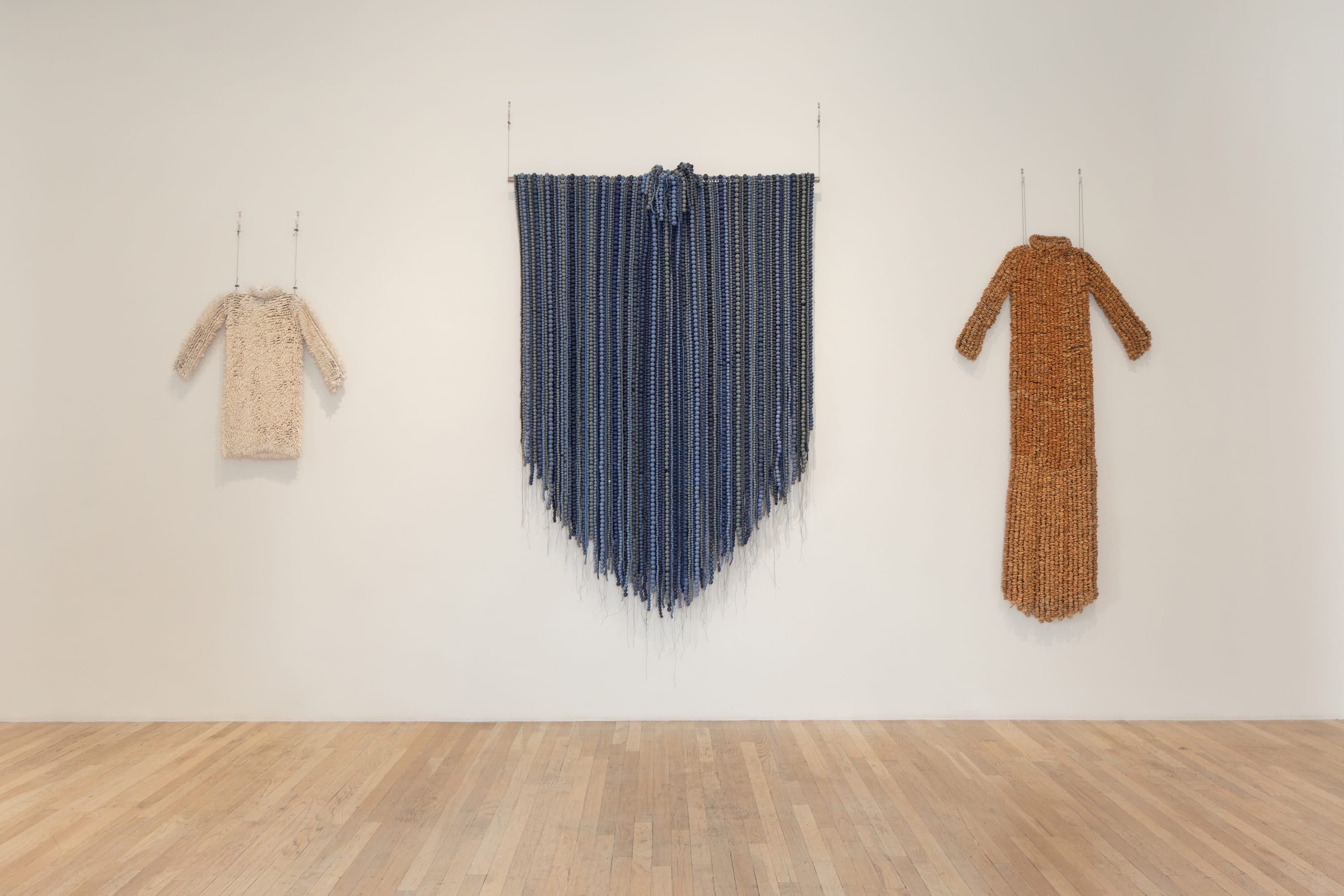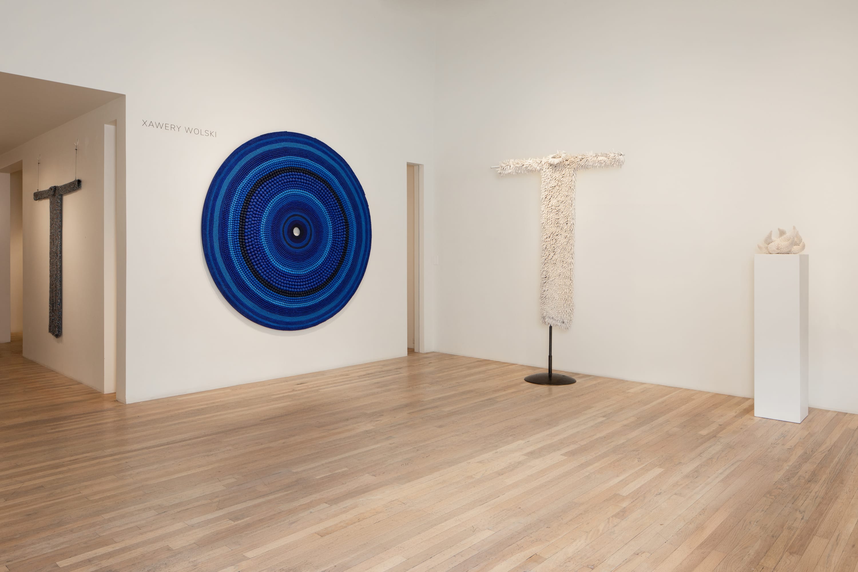 In the singular voice that reverberates throughout all of Xawery Wolski’s work, Metamorphosis presents a selection of sculpture that employs material and form to speak to themes of time, space, freedom, connection and communication. This exhibition showcases a body of work spanning from 2004 through 2023 made from bonze, fiberglass, clay, and glass. Despite the varying mediums on view, the exhibition unifies to one voice: transporting the viewer into a dream-like state of contemplation and curiosity. A smooth, white, terracotta tree; a smooth, bronze figure of a body; a large, vibrant-blue, beaded terracotta circle; a white, spikey terracotta form of a figure; and large dresses knitted together from beads of crystals, seeds and terracotta – all of these seemingly disparate forms, weights and color come together in Metamorphosis to shock the viewer into feeling a moment of freedom or peace. Using material as language, the forms suggest a thread connecting all. As the title of the show suggests, Wolski creates forms that feel transient, as if they could easily transform into one another. The briery, terracotta body (Body, 2014) informs and connects the viewer to the smooth, bronze body (The Dream III)- both utterly unique in composition yet with a similar voice. The past and the future of each piece is left undefined and is only held within the material for this iteration of the form. Just as a dreamer subconsciously threads ideas and creates narrative within their dreams, these sculptures thrill the viewer to construct their own dreamlike narrative.