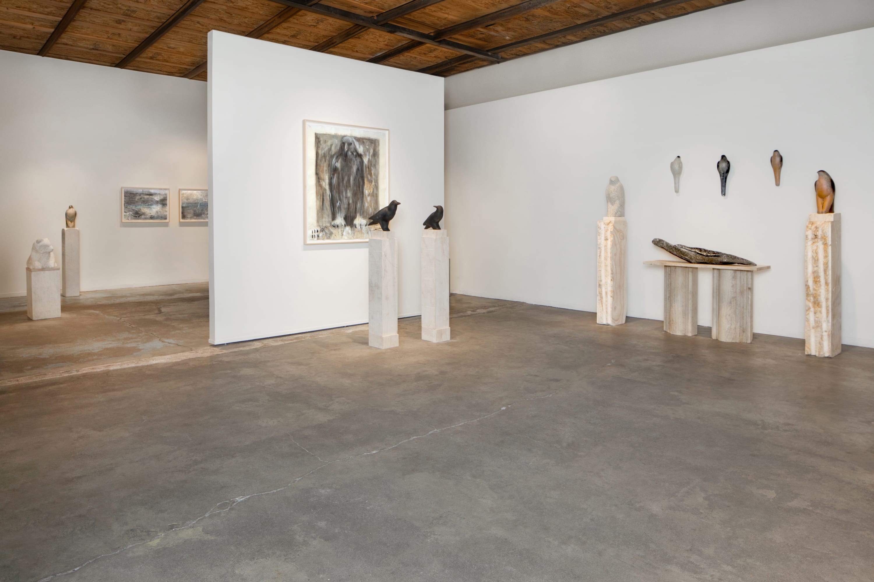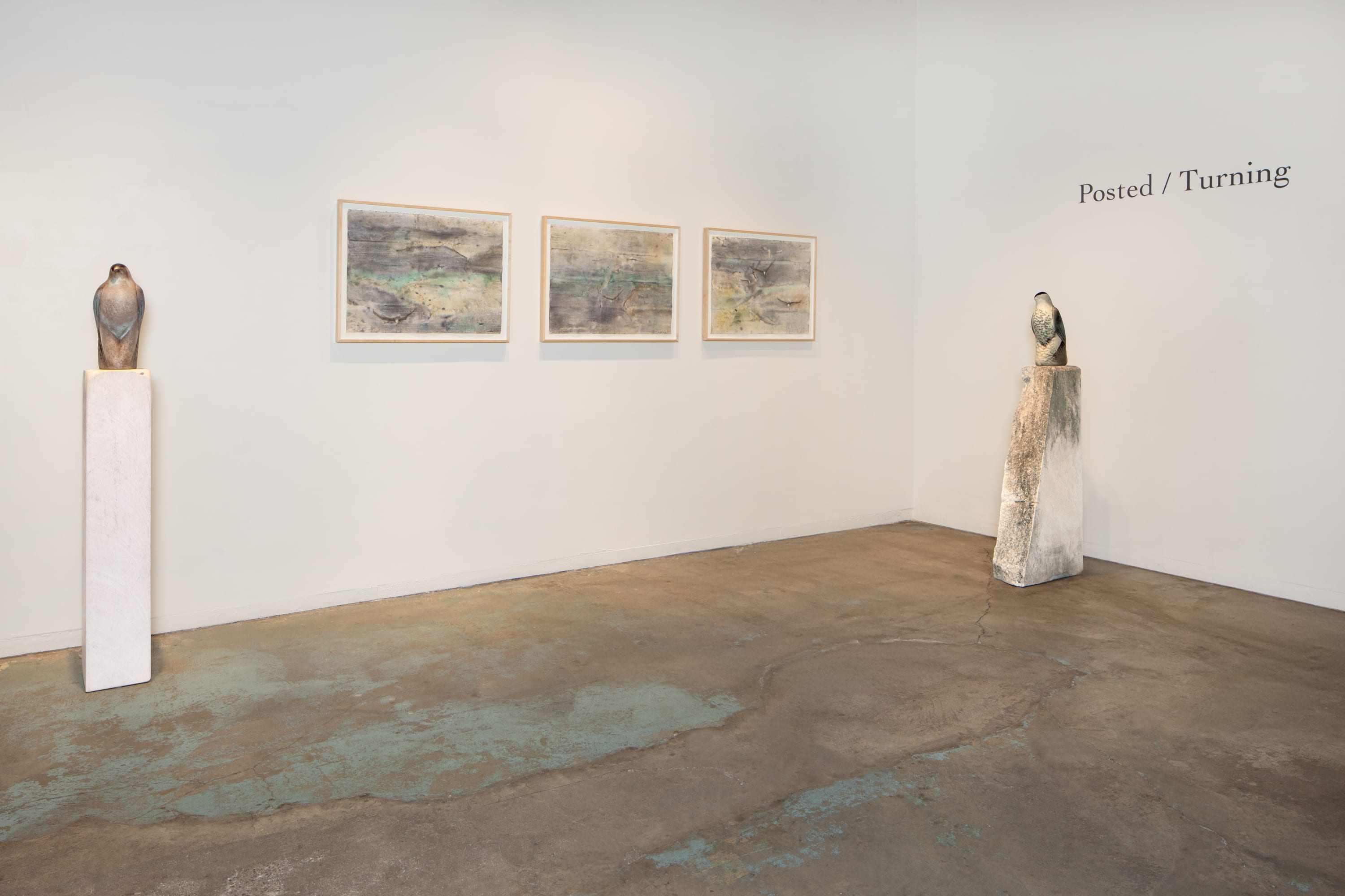 Posted / Turning presents the artist as she is meant to be, a true maestra at the height of her prowess. The exhibition presents new work from Jane Rosen, a celebrated sculptor and draughtswoman, bringing together colossal feats of stone carving with innovative handblown glasswork and her signature layered sumi-e ink drawings. Some of the work, such as Sahara Falcon and Red-Shouldered Hawk, sit on magnificent pedestals hewn from incredibly rare Beaumanière stone salvaged from a now-closed French quarry, while other works incorporate collected stones she has been bringing to life over the course of thirty years. Rita (for Hayworth) and Sophia (for Loren), Jane’s “glamour girls” and birds she’s called “the pieces of a lifetime,” are hand-blown glass birds that were rolled in marble and carved hot at 1600 degrees Fahrenheit. Each is perched on stone akin to the “eternal beam of light” Rosen refers to in her artist statement above.